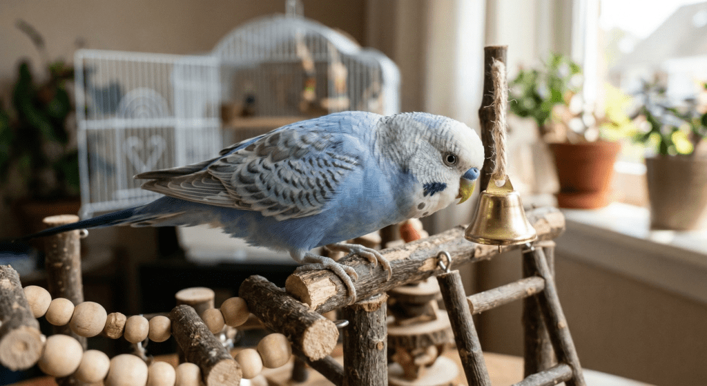 (Image 3: A domestic blue male budgie close-up, perched on a specialized wooden playground, leaning toward a small bell. His posture shows curiosity as he engages with his environment.)