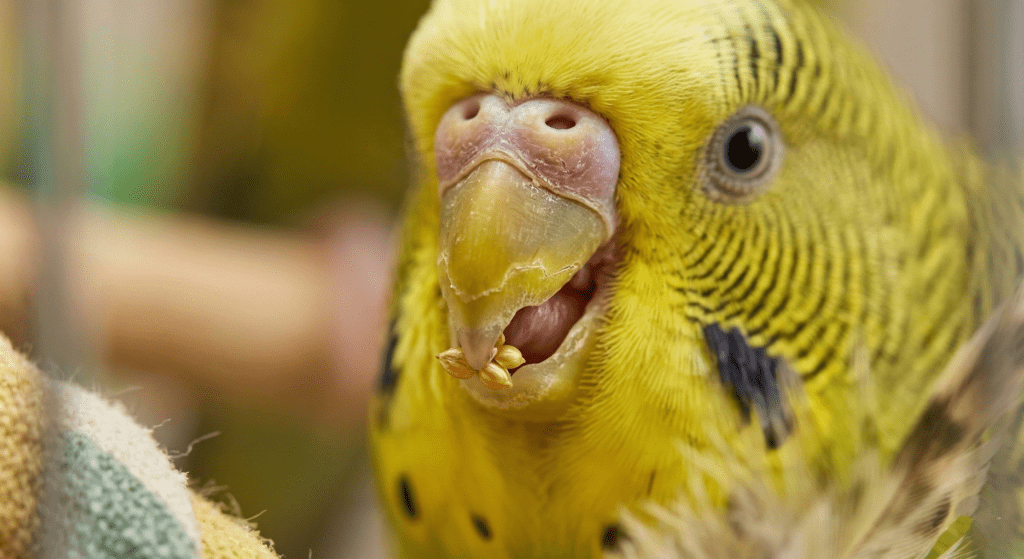 (Image 2: An extreme close-up focusing on a budgie’s beak as it maneuvers a single, small millet seed. The sharp focus on the beak highlights how they handle their food.)