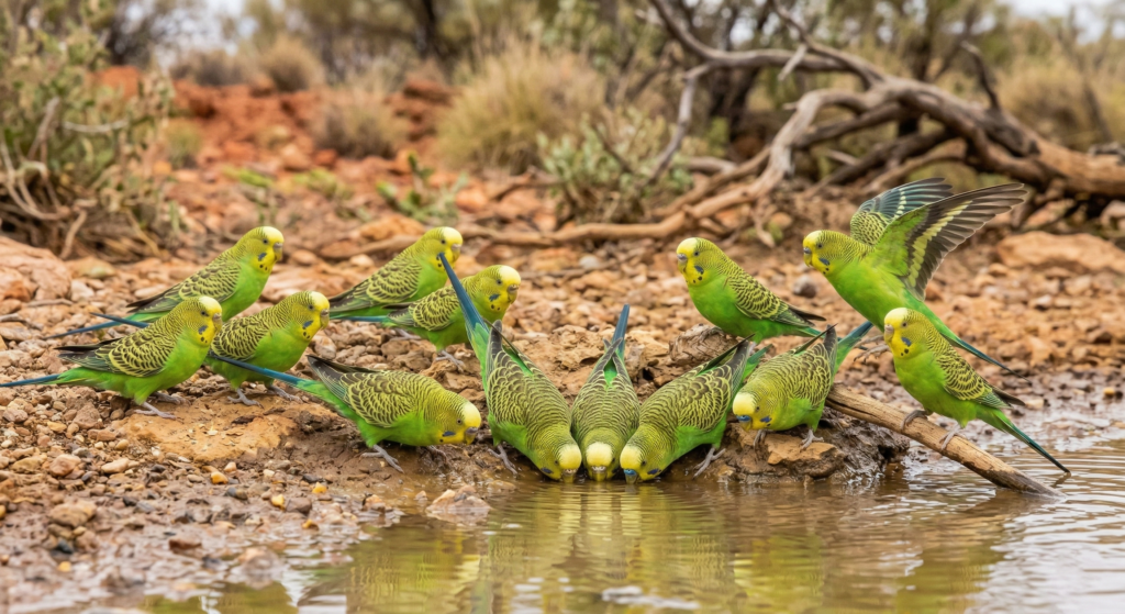 (Image 1: A massive flock of wild green budgies in their native, arid Australian environment, swirling near a waterhole at sunrise.)