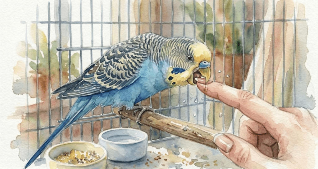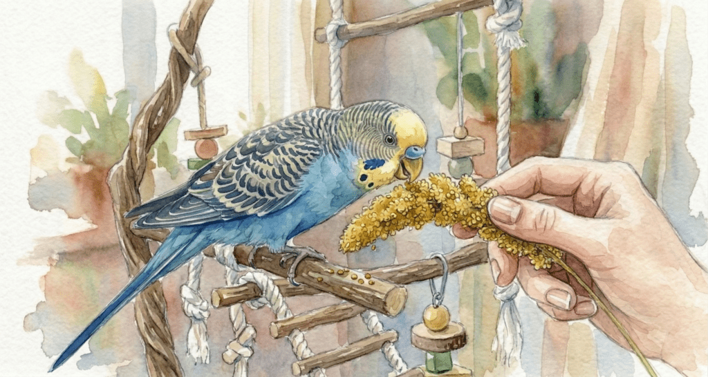- The Millet Offer: Start by slowly offering a long spray of millet through the cage bars. Do not force the bird to come to you. Let it see that the hand produces things it likes.